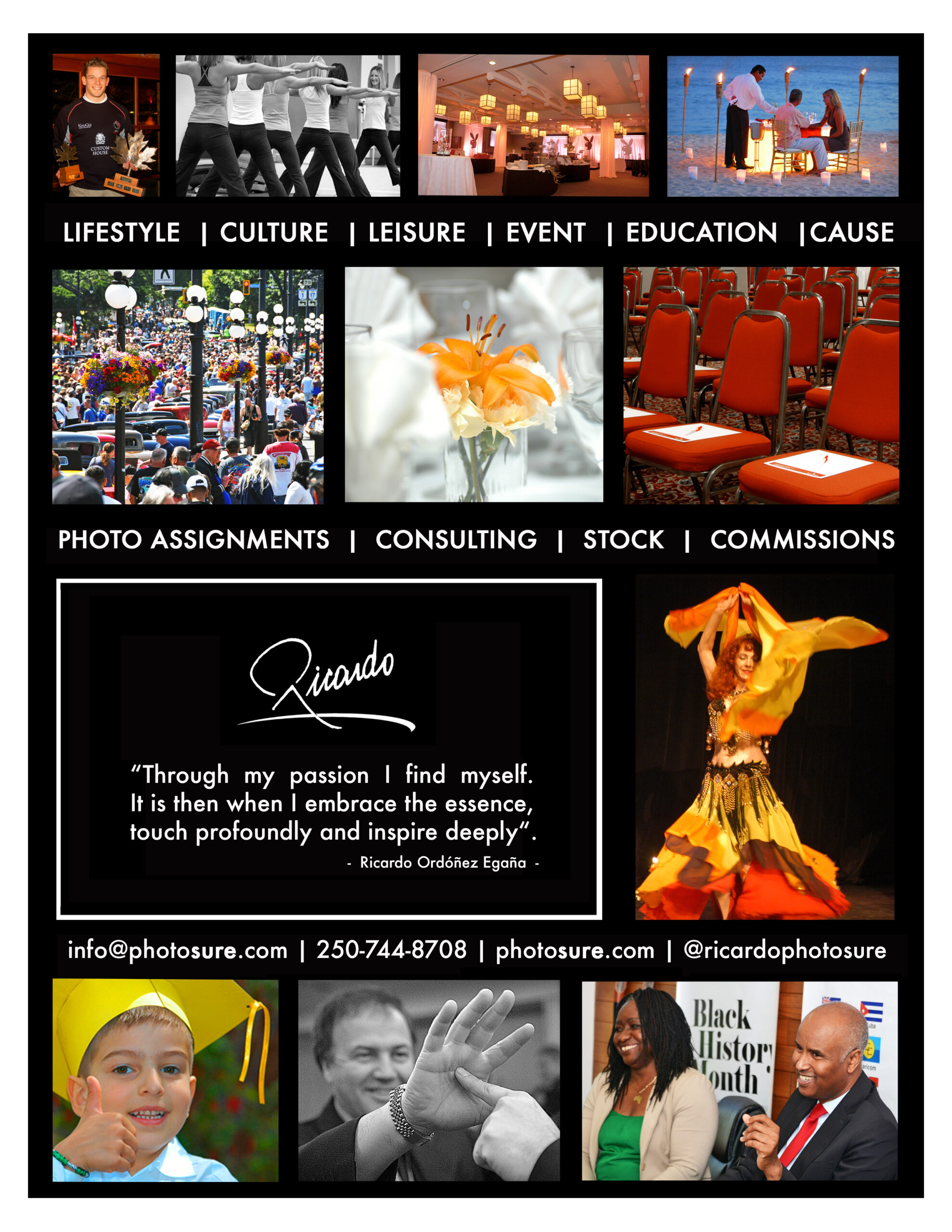 Ricardo’s photography has worked on numerous assignments, commissions and projects, with his photographs gracing many covers, publications, advertisings, marketing collateral, as well as covered a wide range of special events and multicultural festivities.